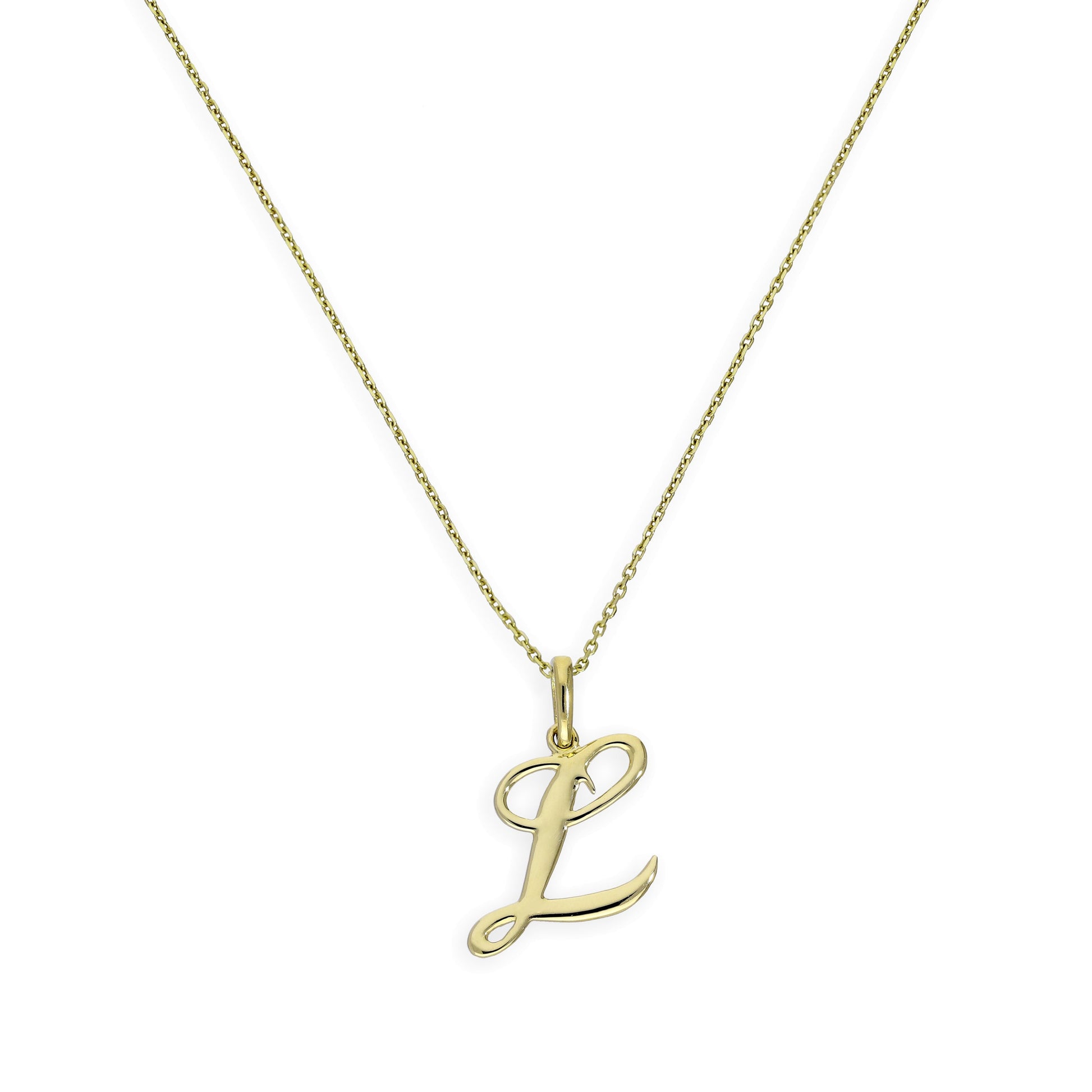 Halskette mit Anhänger aus 9 Karat Gold mit verschnörkelter Kalligraphie-Schrift und Buchstabe L, 40–50 cm