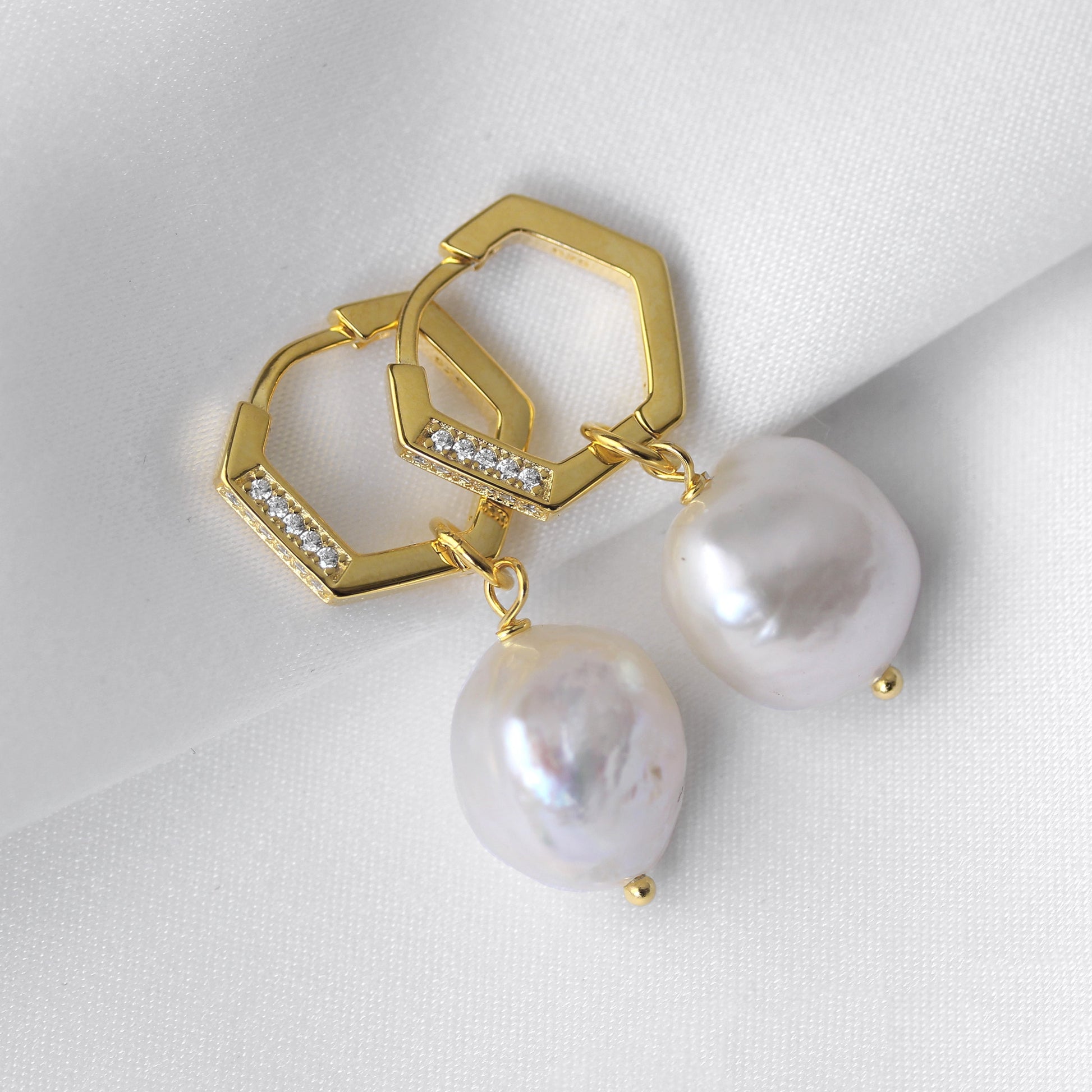 Vergoldet Sterlingsilber Süßwasserperle CZ 14mm Creolen Ohrringe