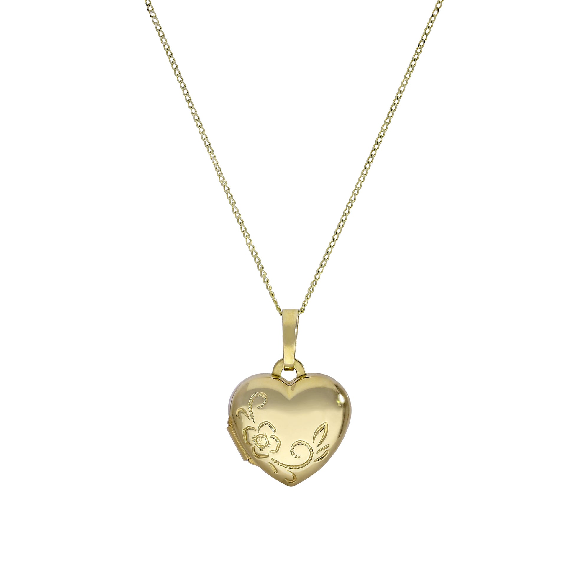 Kleines gravierbares Herzmedaillon aus 9 Karat Gold mit Blumenmuster an einer Kette, 16–20 Zoll