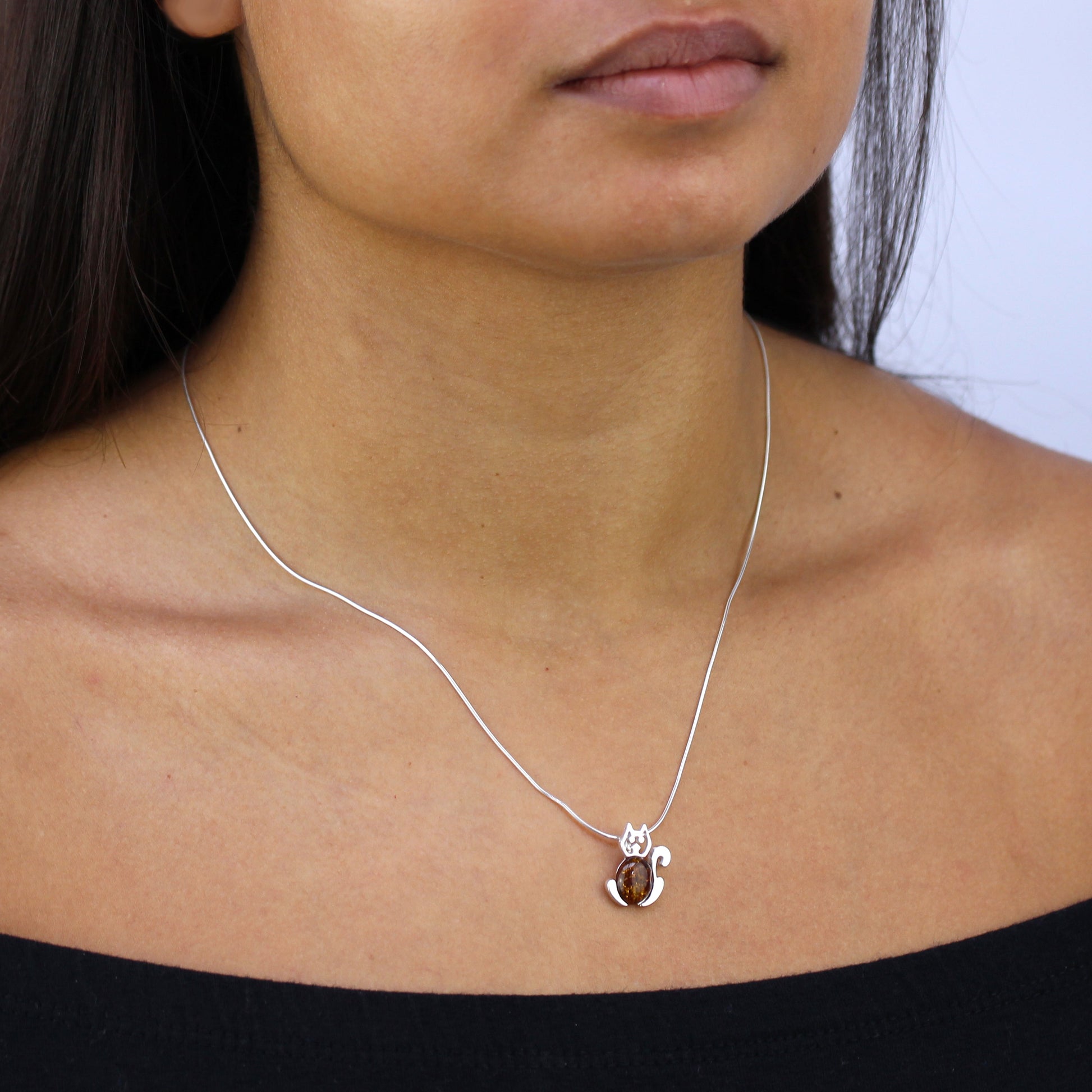 Halskette mit Anhänger aus Sterlingsilber und baltischem Bernstein in Katzenform, 14–22 Zoll