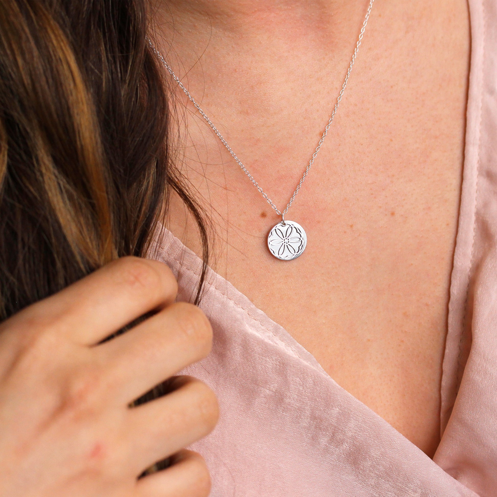 Sterling Silver February Violet Birth Flower & 13mm Engravable Tag Necklace 14 - 22 Inches
