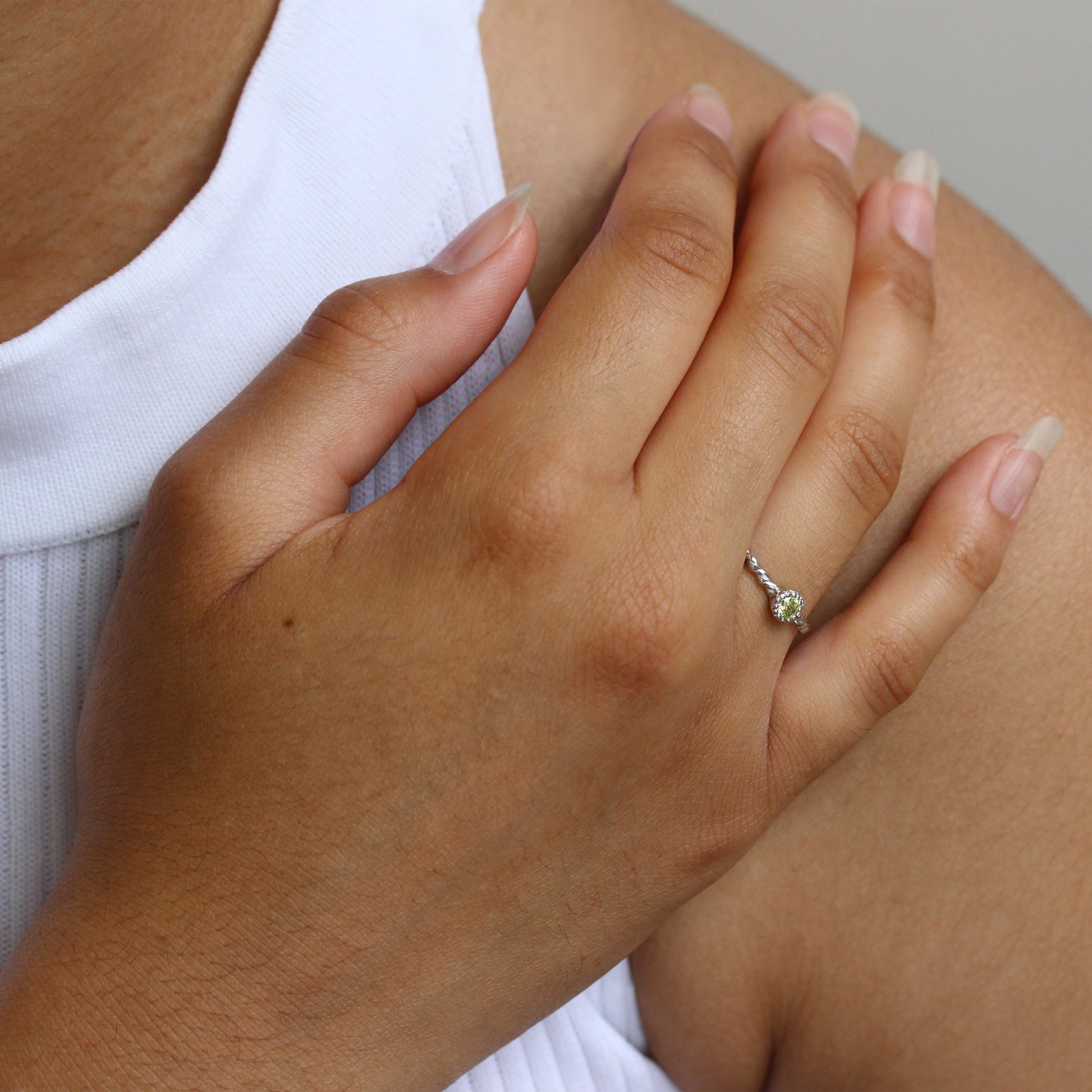 Sterlingsilber & Peridot CZ-Kristall August-Geburtsstein-Ring mit gedrehter Kordel I – U